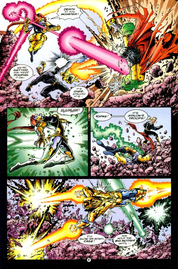 Suddenly, out of intense anger, UltraForce jointly attack the king of the fire people. Topaz states that Pixx will not die unavenged as Prototype blasts Atalon. Hardcase strikes the king followed by blows delivered by Prime and Topaz. Prime is about to strike Atalon but gets distracted when the downed king mentioned he wants to reform the whole world. Atalon strikes Prime’s head and gets back up to keep fighting the rest of UltraForce.