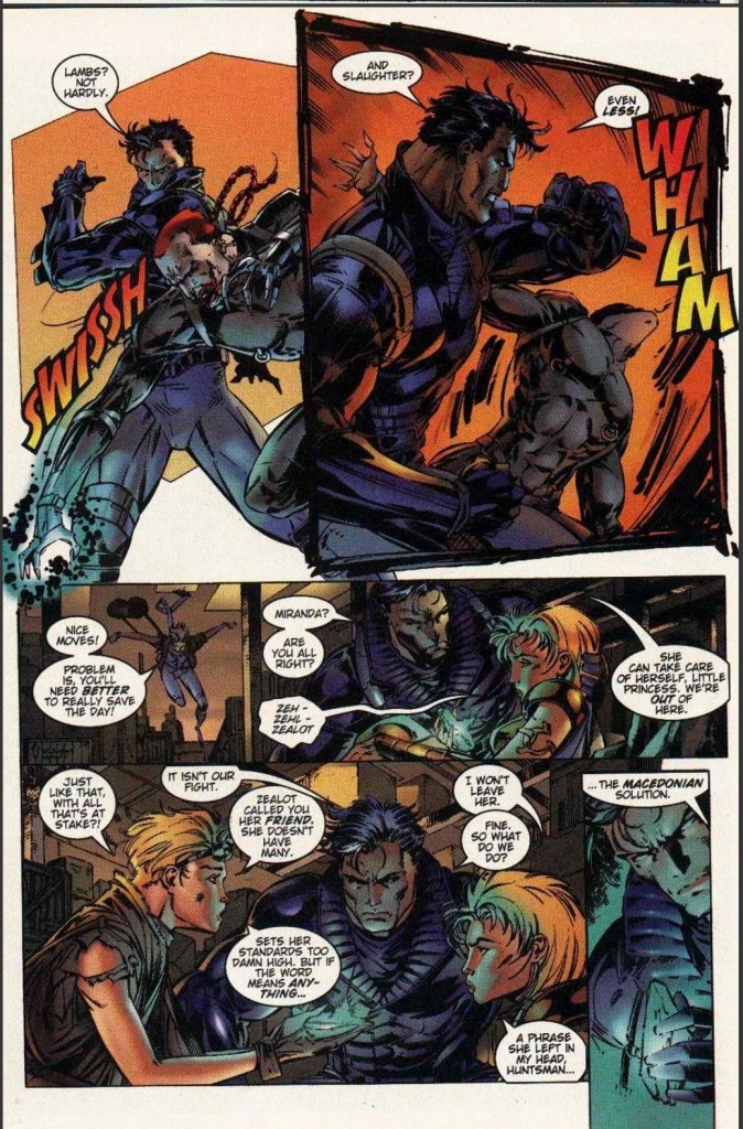 As for Zealot and the Huntsman, their alliance in this story has progressed more as well. Under Chris Claremont, the fearless Zealot was portrayed to be struggling very hard as she became more vulnerable than ever! This is Zealot that has to be seen! As for Huntsman, he truly is an effective fighter. So much so, he sure can fit into the WildC.A.T.S and keep up with their action. Still, Huntsman is indeed an honorable man as he still dedicates himself in protecting Miranda (who is a lot more than she appears) while making his moves to help Zealot at her most vulnerable time.