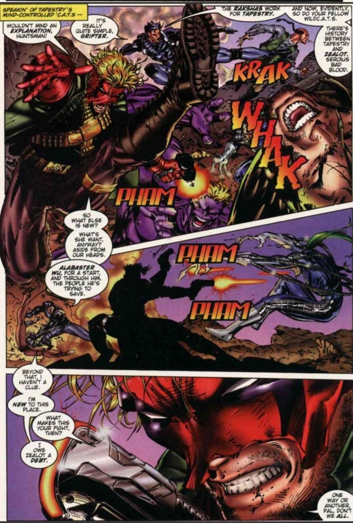 Meanwhile, Grifter, Hunstman, Zealot, Savant, Soldier and Mr. Majestic fight the mind-controlled WildC.A.T.S – Spartan, Maul, Jacob Marlowe and Warblade – and Alabaster Wu who are acting under Tapestry’s evil. As Grifter shoots Maul and kicks Jacob Marlowe’s head, Huntsman reveals to him that Tapestry and Zealot have a history together while Alabaster Wu was trying to save his people…