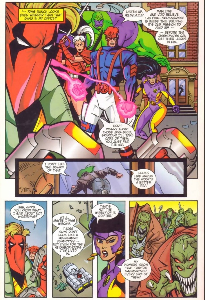 Suddenly, a group of people are rushing towards the WildCATs. Powered with the Sight, Voodoo realizes that the mob is composed of Daemonites disguised as humans. The WildCATs and the mob engage in battle.