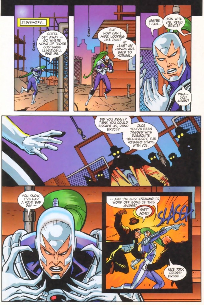 Knowing he is outnumbered, he quickly runs out of the office for safety. He heard one of the men referred to him as a crossbreed whelp. As soon as he finally leaves the building, Reno sees the WildCATS team composed of Grifter, Spartan, Zealot, Voodoo and Maul. Thinking that the WildCATS are out to kill him like the armed men, Reno keeps on running away.