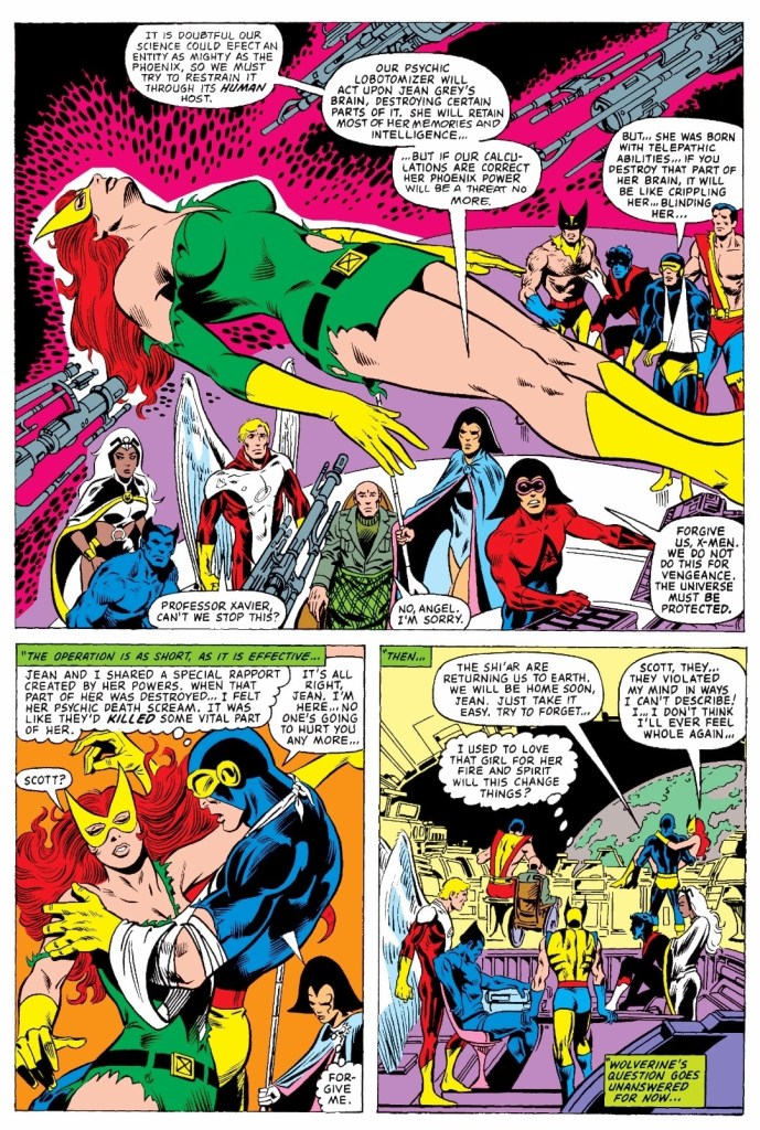 Jeay Grey remains alive, floating above the X-Men and the others as Lilandra’s people prepare to start the process of the psychic lobotomizer on her. Their intention is to act upon Jean Grey’s brain and destroy certain parts of it in order to neutralize the Phoenix power within her. The operation turned out successful and Jean Grey survives once more. She and her fellow X-Men return to Earth…