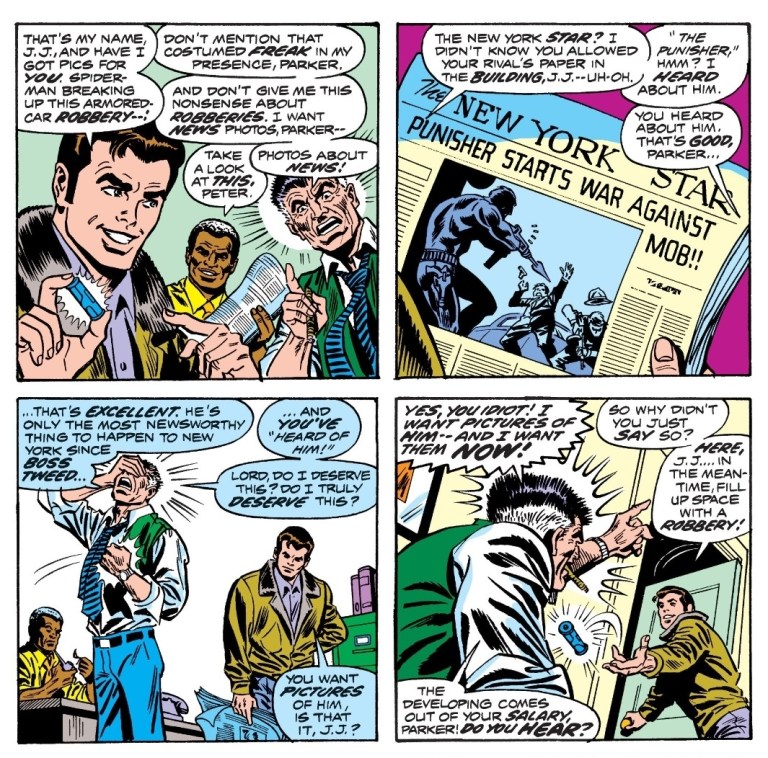 Elsewhere, Spider-Man swings into action and successfully stops an armed robbery from happening. Along the way he managed to capture photographs, changes into his civilian clothes and enters the Daily Bugle’s office ready to submit the roll of film as Peter Parker. Unfortunately, his superior J. Jonah Jameson disregards Parker’s submission and points out that the Punisher made waves with New York’s readers via the Bugle’s competitor The New York Star. For Jameson, the Punisher is only the most newsworthy thing to happen to New York and tells Parker he wants photos of the assassin…
