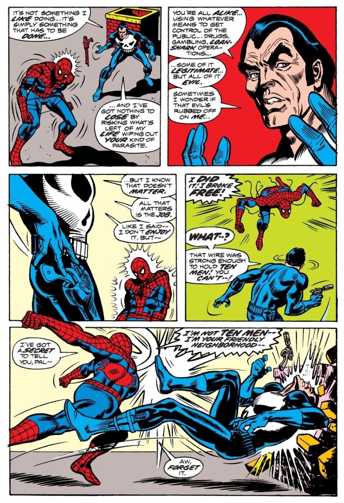 This is a scene from the first of two encounters between Spider-Man and the Punisher who was introduced as an assassin.