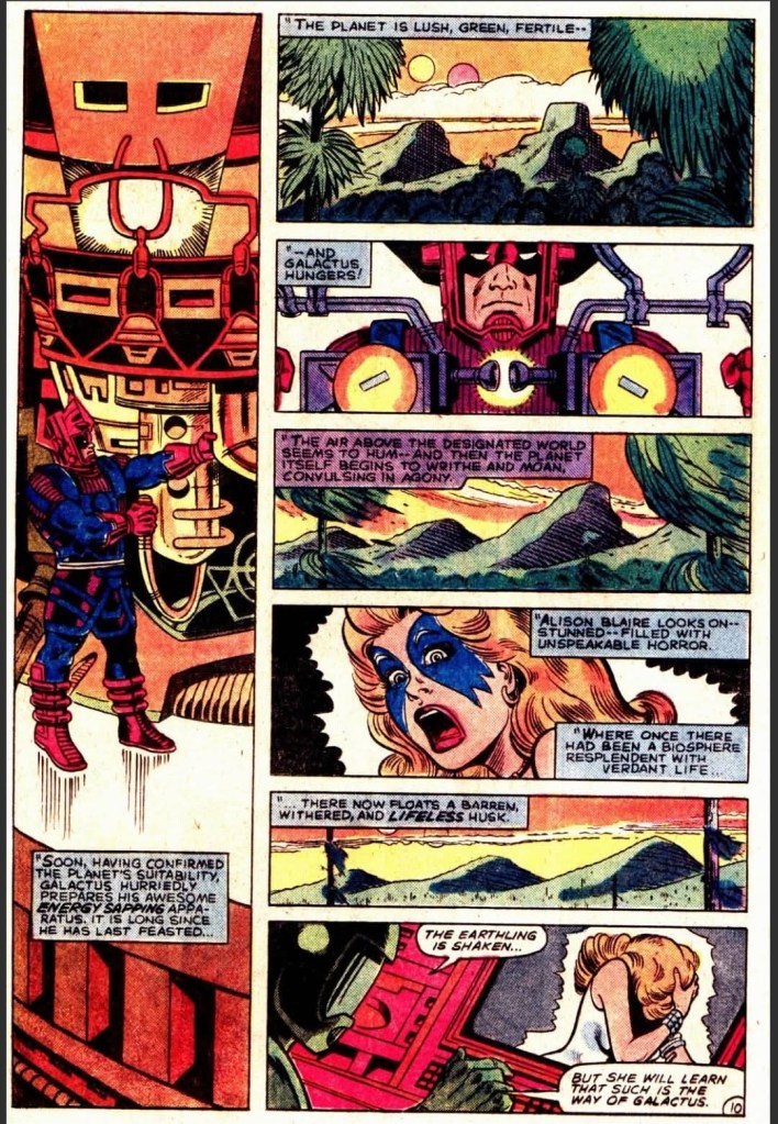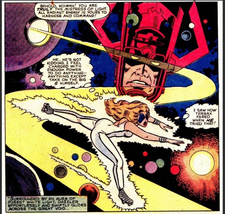 After doing advanced work, Dazzler can only watch and witness the loss of life as her master Galactus consumes the planet.