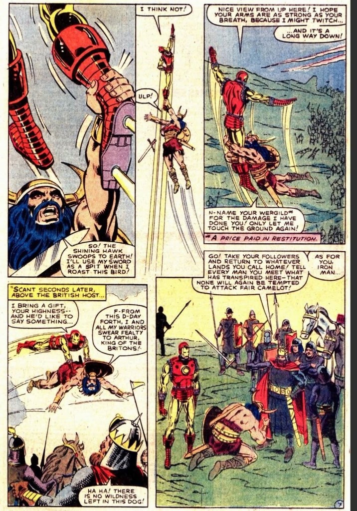 The stranded Iron Man makes an impact on a battle favoring King Arthur.