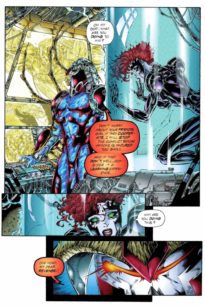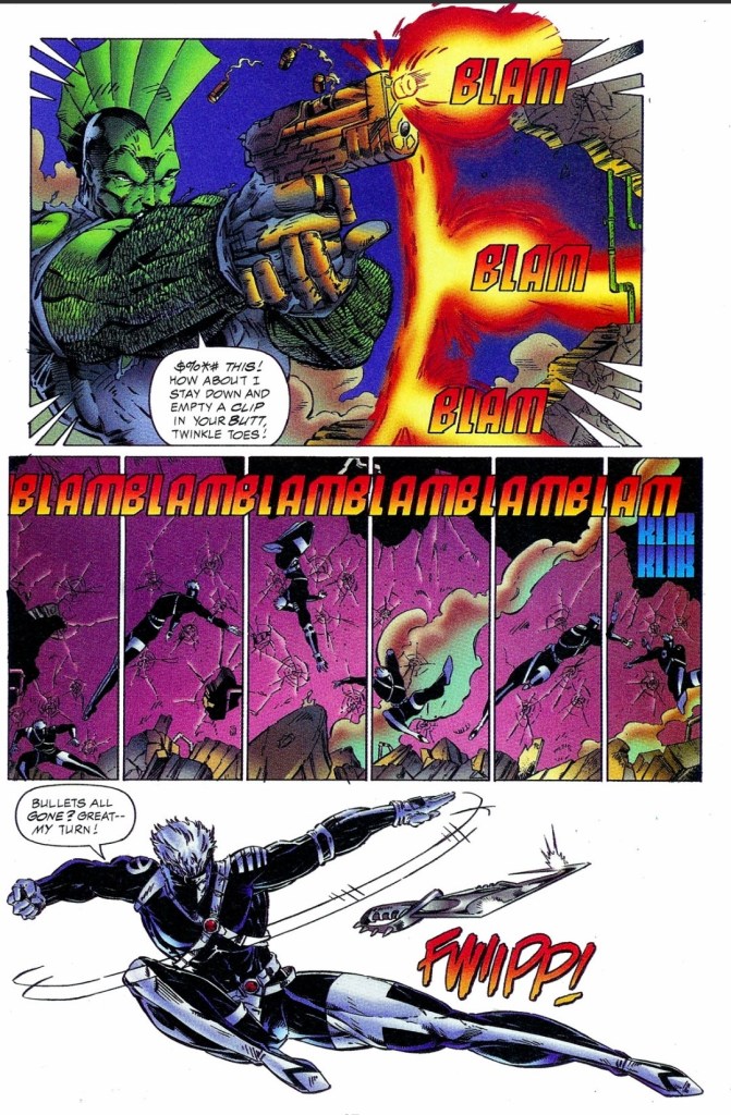 In my previous retro review, as the mission of Backlash and Taboo intensified, Zealot and Void of the WildCATs got involved in the action. Pike, who had been serving S’ryn, proved to be a formidable foe for Zealot and Taboo. The Savage Dragon meanwhile proved to be more than capable of bringing down S’ryn which made Backlash less relevant in his own comic book. Just as things intensified, something big blew up.