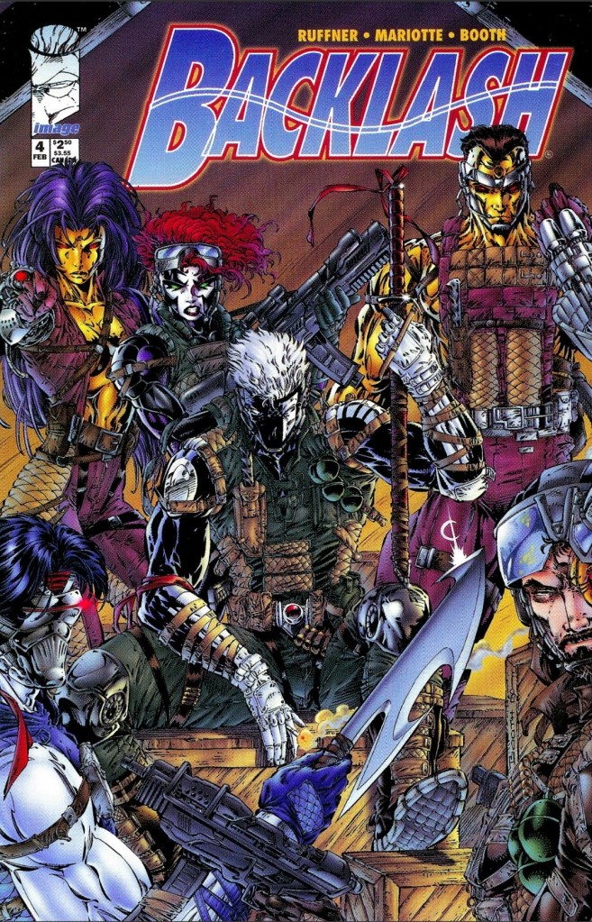 With those details laid down, here is a look back at Backlash #4 published in 1995 by Image Comics with a story written by Sean Ruffner, Jeff Mariotte and Booth. Booth was the artist.