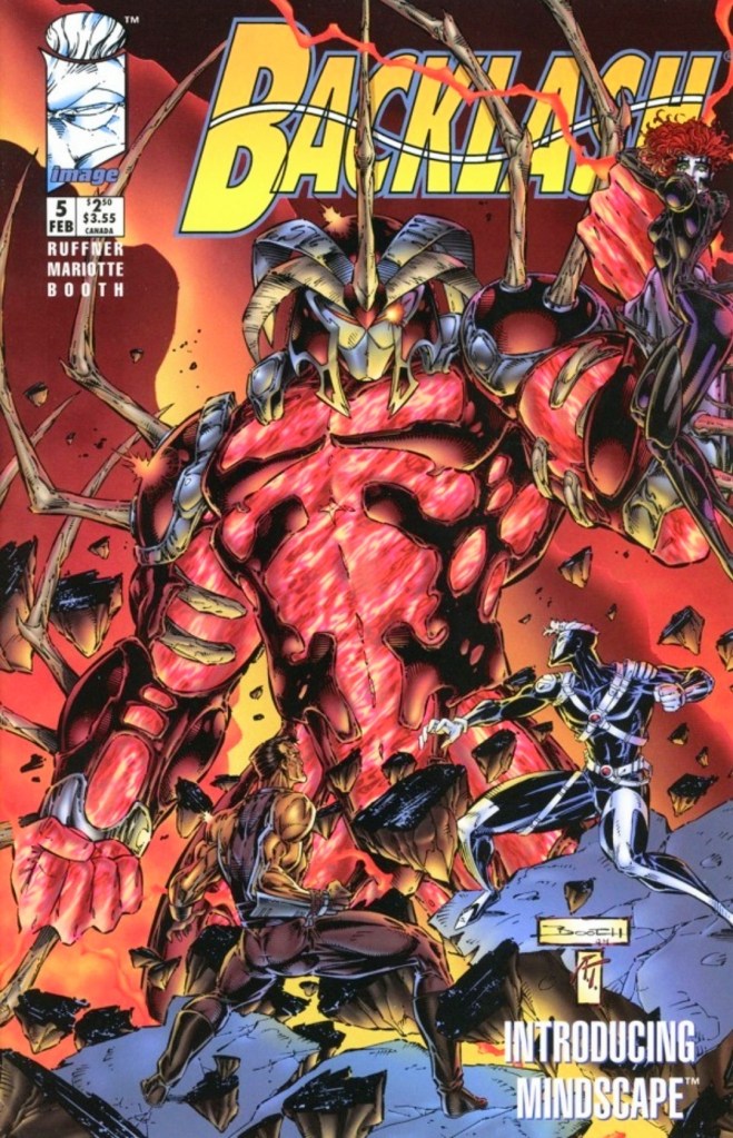 With those details laid down, here is a look back at Backlash #5, published in 1995 by Image Comics with a story written by Brett Booth, Jeff Mariotte and Sean Ruffner. Booth did the artworks.