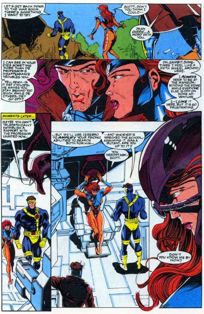Over at the mansion of Xavier, Rogue wakes up from a very intense nightmare which prompts Cyclops and Gambit to calm her down. Rogue reveals that she has been having very disturbing visions ever since Professor X disappeared. It turns out, Xavier helped her previously by using his mental abilities to block out the unpleasant memories of hers.