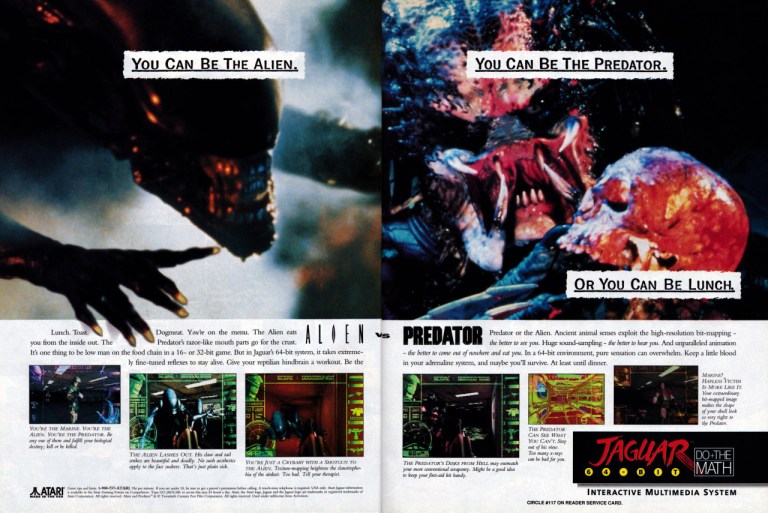 To sell the game, Atari came up with a 2-page ad highlighting the Aliens on one page and the Predator on the other. As the Predator was shown with a grotesque human skull, the use of photographs (most likely sourced from the movies) strongly emphasize the game was aimed at the mature audience among gamers. Six screenshots of gameplay were displayed by the ad makers who were clearly aware of the high popularity of first-person shooting games. Alien vs Predator was a critical and commercial success, and its print ad is arguably the most memorable one of any Atari Jaguar game ever made.