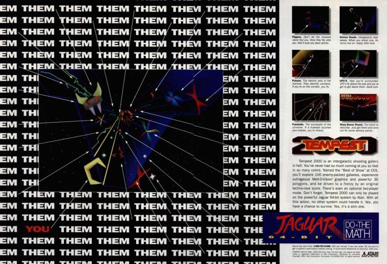 As a Jaguar-exclusive game, Atari came up with an eye-catching 2-page ad showing off the 3D visual presentation (6 gameplay screenshots and one original artwork) while boasting in the text description that Tempest 2000 was named the “Best of Show” at the Consumer Electronics Show (CES). The game was released in 1994 attracting mostly positive reviews from game critics and was one of the best-selling Jaguar games (note: Tempest 2000 can now be played in the Atari 50 collection). With the Atari legacy and presentation combined, this print ad remains captivating to look at.