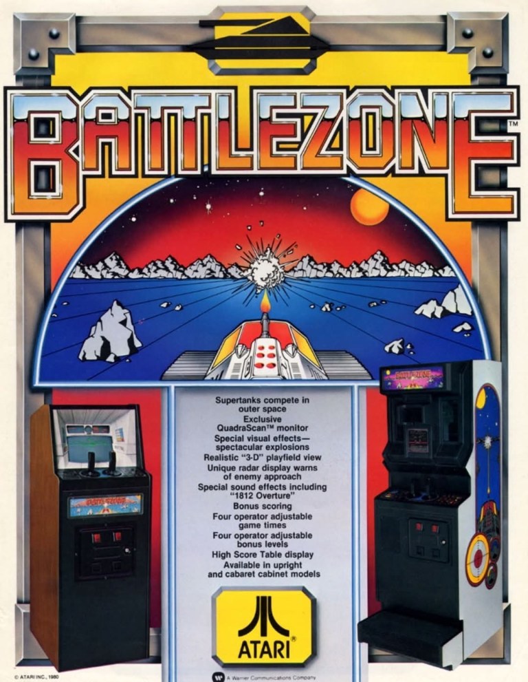 In the history of video games, Battlezone was a groundbreaking game both visually and with game design. It was designed to give gamers an immersive experience of driving a tank with 3D graphics, fun gameplay and a first-person view. Its own history is worth researching. Atari knew it had to heavily promote their ambitious game and the arcade flyer above featured nice hand-drawn artwork while also showing the two types of Battlezone machines that arcade operators can choose from. Battlezone went on to become a highly influential arcade game.
