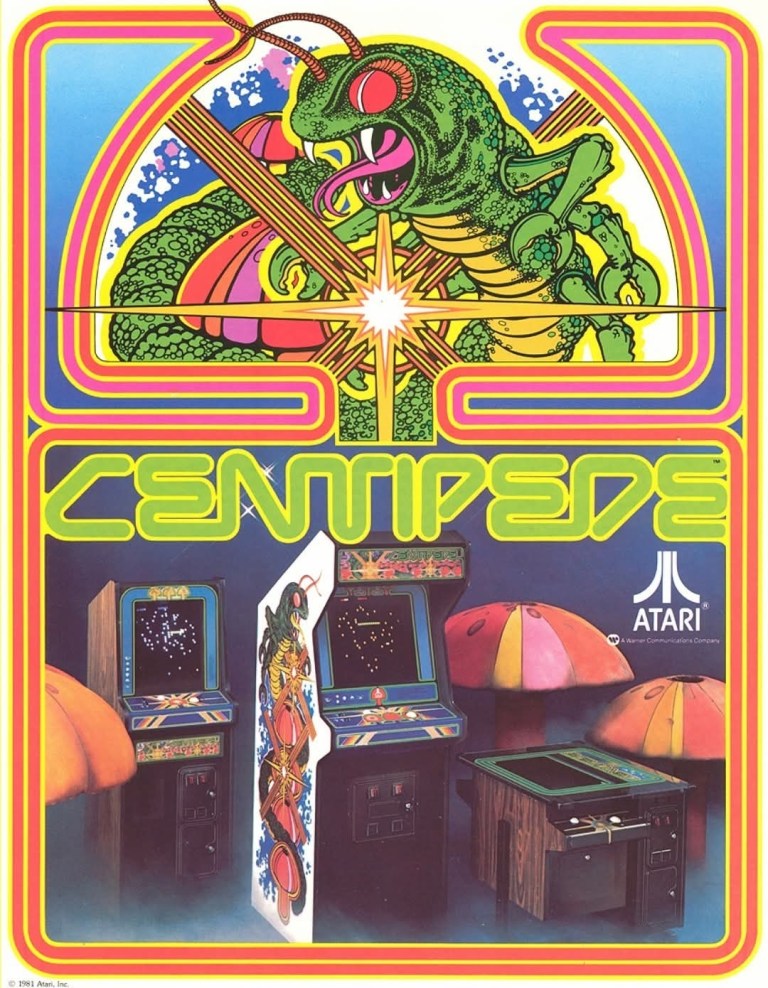 Centipede is another arcade classic from Atari. Released in 1981, a lot of players enjoyed the game’s simplistic and yet addicting design of shooting an incoming centipede and its remaining portions that move down the field. Similar to the Battlezone arcade flyer, this game’s flyer had nice art of a centipede on the top and images arcade machines. Even by today’s standards, this flyer remains eye-catching.