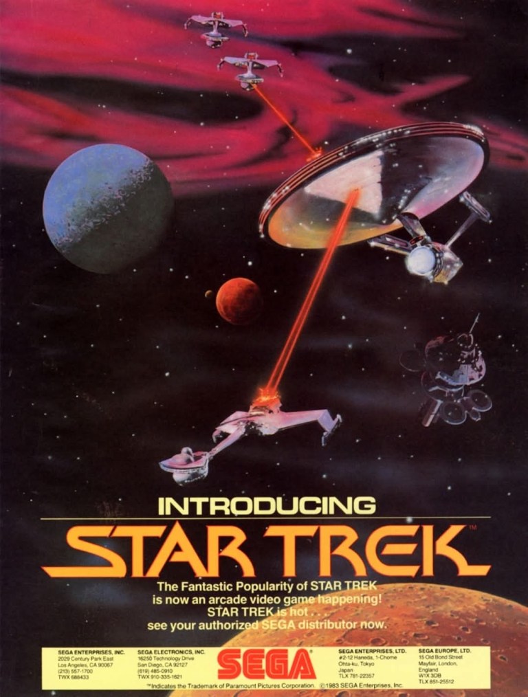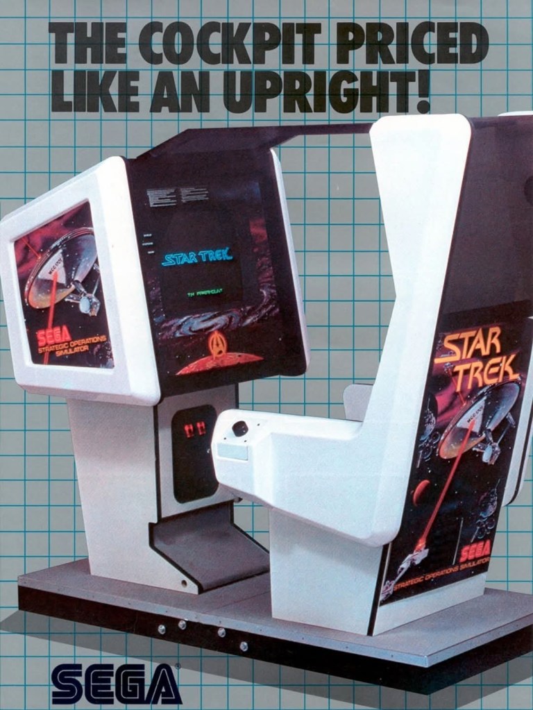 I never played the Star Trek arcade game (full title: Star Trek: Strategic Operations Simulator) Sega released in 1983. I only saw its graphics and gameplay during an episode of Starcade. With its game design and visual presentation, Star Trek was a very ambitious arcade project for its time and Sega really went in to promote it. The initial arcade flyer (first one above) was meant to grab the attention of both gamers and arcade operators. The next arcade flyer (2nd one above) showed the ambitious design of the arcade machine made with player immersion in mind.