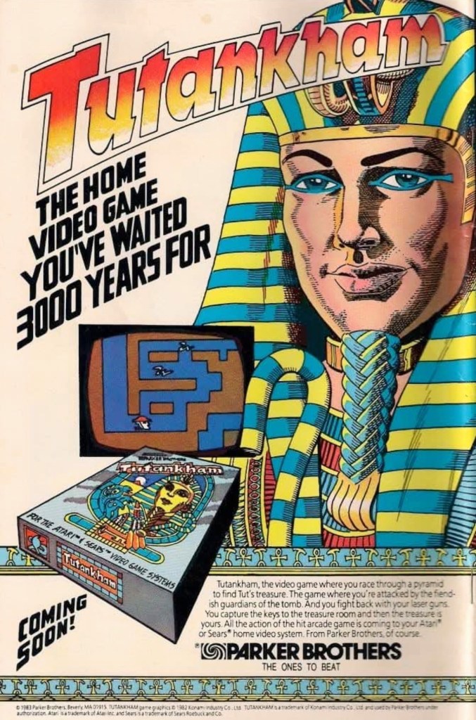 First released in the arcades in 1982, Tutankham is a 2D adventure game that had a mix of shooting, maze exploration and puzzle-solving with Egyptian settings and concepts. It made its way to the Atari 2600 published by Parker Brother, and it was this specific version I played. This game print ad appeared in comic books I read in 1983, and the people who made it implemented a hand-drawn art of the Egyptian pharaoh Tutankhamun dominating the space to emphasize the Egyptian setting. In fact, this ad made me think more of Egypt and left little to give me an idea of the game design.